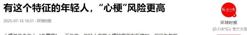 参考文献:环球时报:《有这个特征的年轻人,“心梗”风险更高》2025-07-16